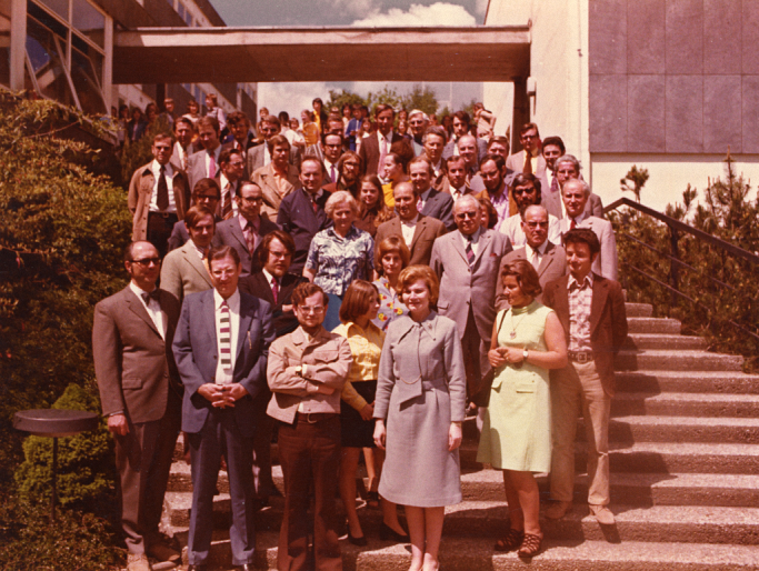 Ehemalige Lehrer 1962 vor dem Eingang der Baracke von Herrn Dieck